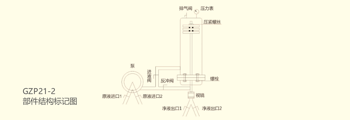 正常過濾周期結束后,工作壓力表指示到0.3MPa, 同時觀察視鏡流量很少時,關閉原液進口閥2,同時關閉凈液出口閥2, 關閉泵電源。